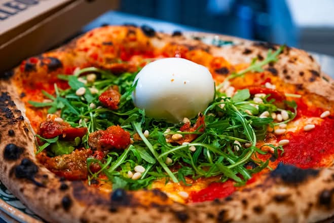 Ingrédients : Base tomate, mozzarella, burrata, tomates confites, pignons de pins, roquette.