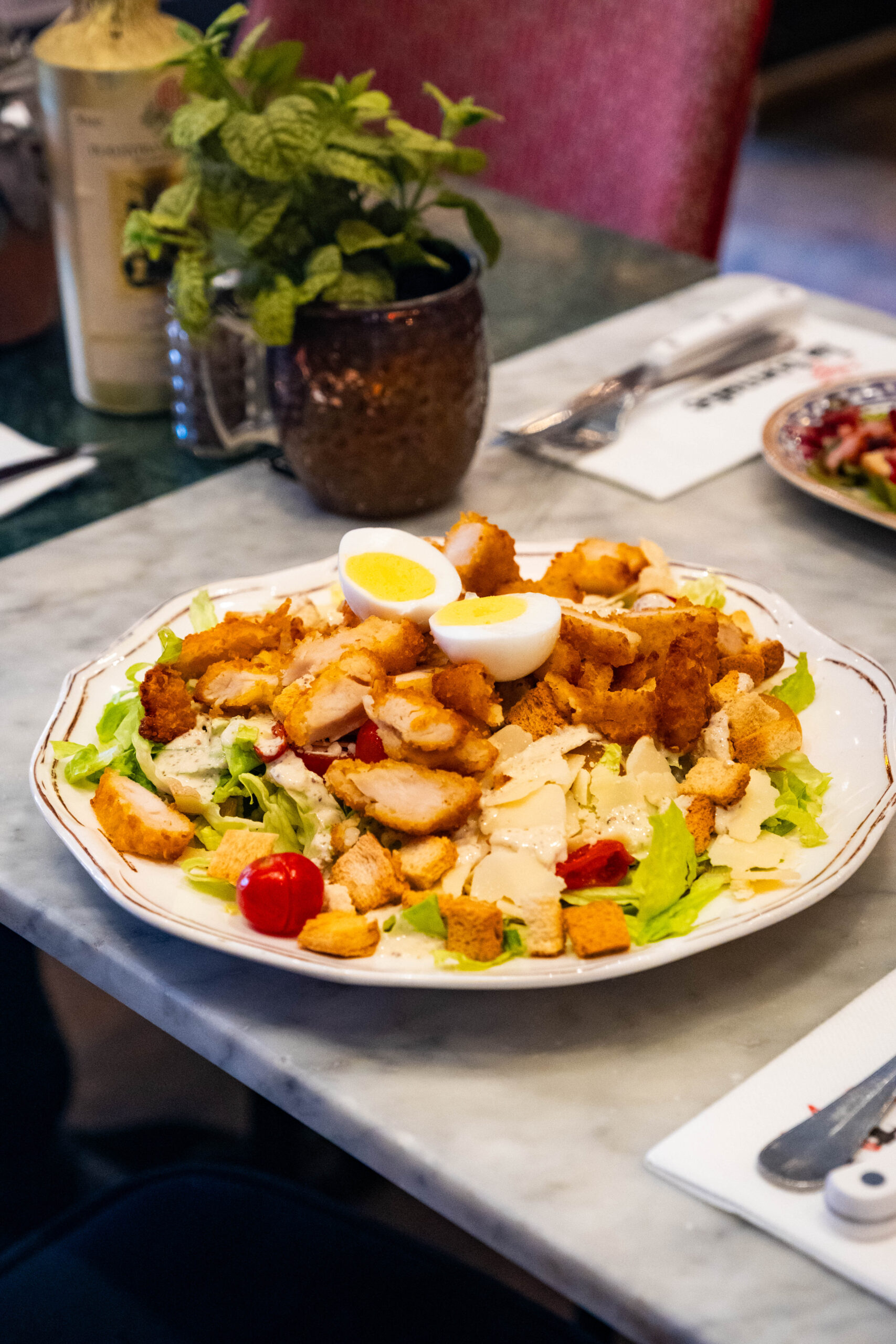 poulet croustillant, oeuf dur, croûtons, salade romaine, sauce Caesar, parmesan et tomates cerises