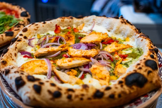 Base crème au pesto, mozzarella, oignons rouges, poulet et poivrons.