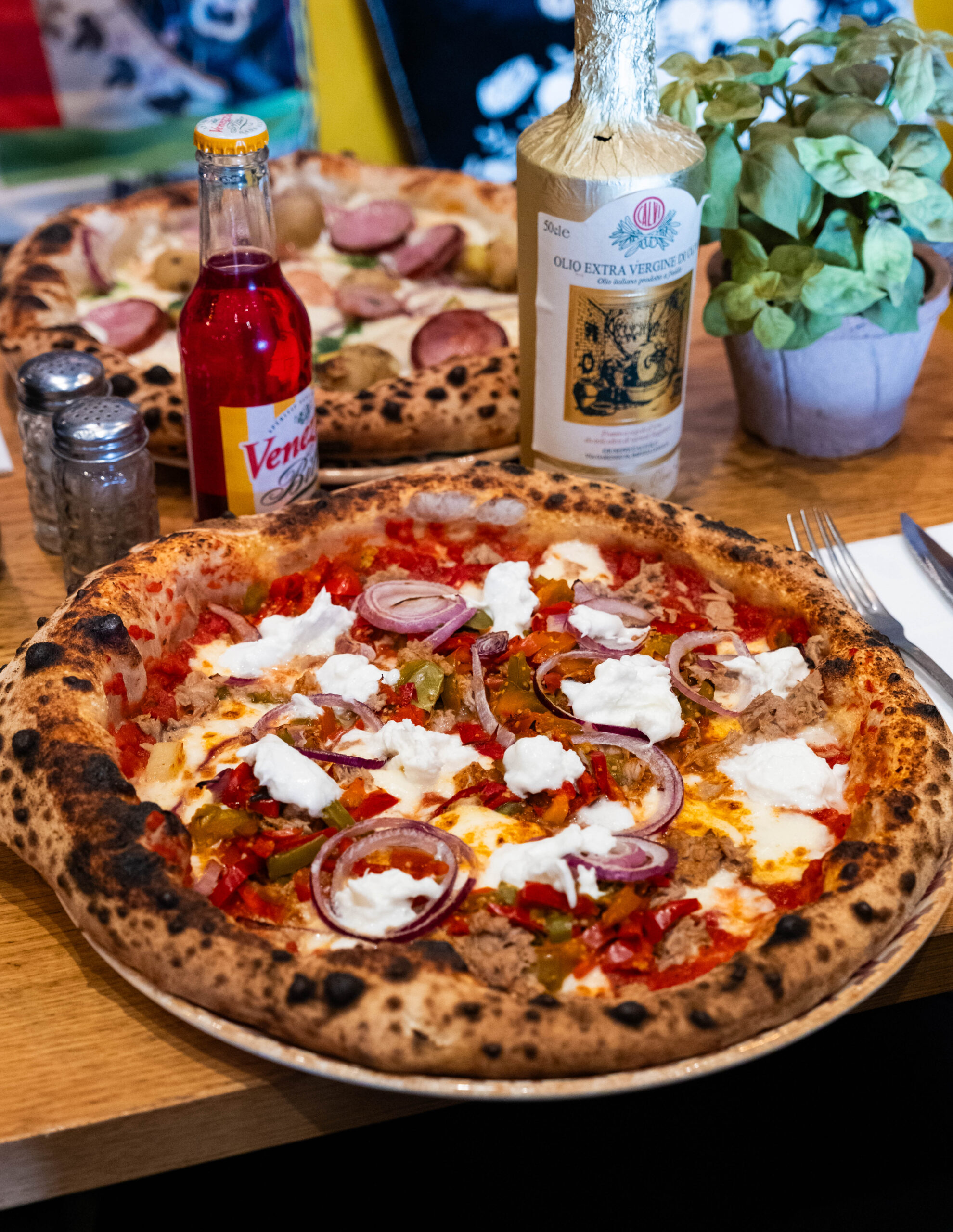 Ingrédients : Base tomate, fio di latte, thon épicé, poivrons, oignons, olives, buffala.